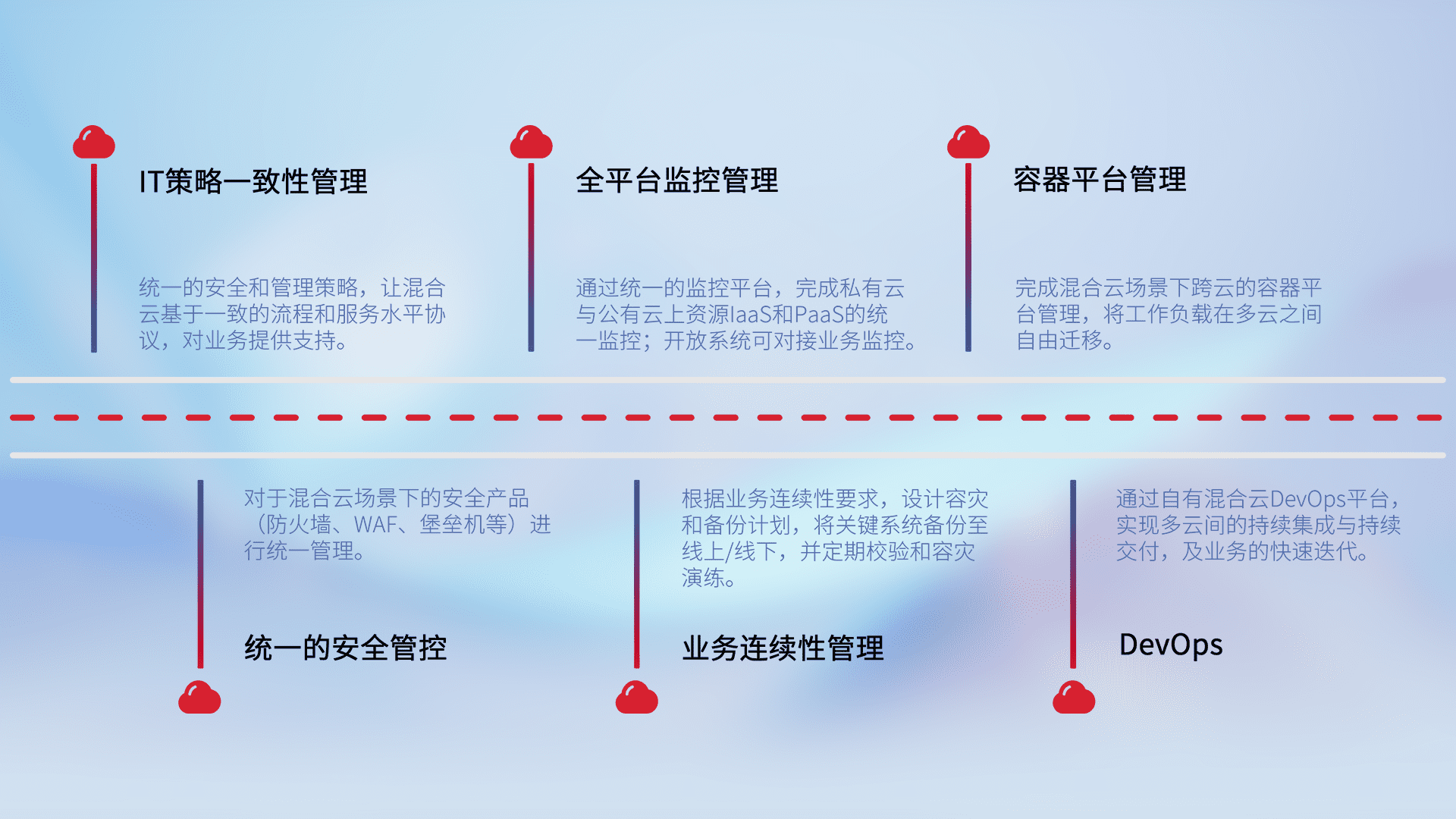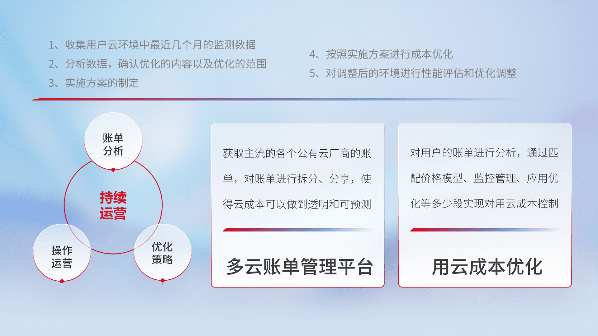 通过多云纳管,,,以统一的资源数据模型把客户的云资源进行抽象和封装,,,,进而实现对多云资源的统一操作,,,保障云资源管理的可靠性、、稳定性与可用性。。。。量身定制化运维内容,,,配置、、、开发运维、、、补丁管理、、、备份、、监控、、认证和访问管理、、、、审计和日常巡检等,,,,保障在用云过程中的可靠度,,,,稳定度以及高可用率。。