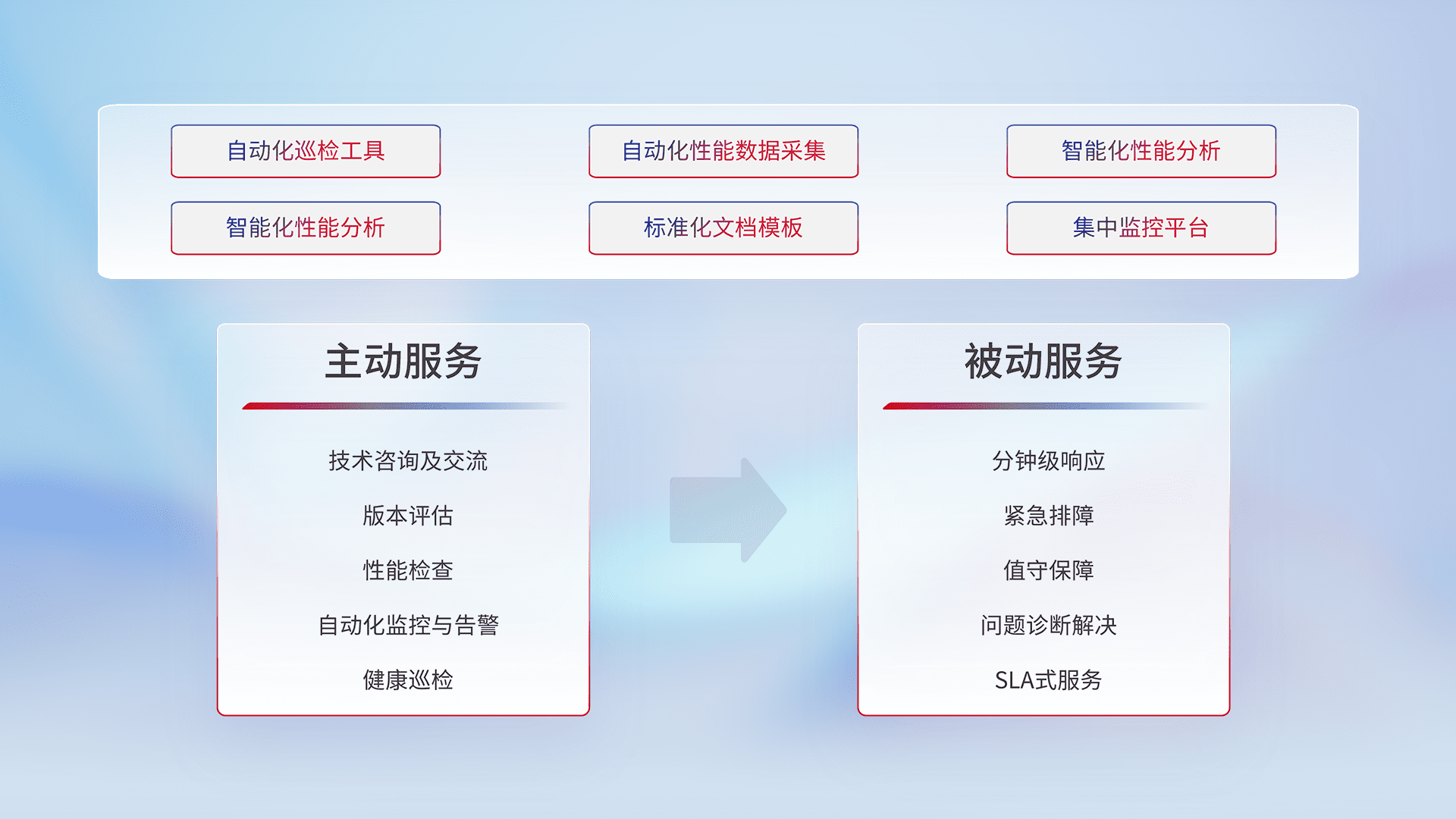 智能化工具和标准化文档,,,保障服务质量,,,提供主动服务(包含技术咨询、、、版本评估、、性能检查、、、、自动化监控与告警、、、、健康巡检)和被动服务包含(分钟级响应、、、紧急排障、、、值守保障、、、、问题诊断解决、、、、SLA服务)。。。。